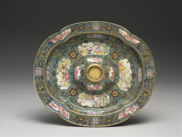 銅胎,四瓣式折沿平底盤,折沿與盤內各有四開光,中心凸起盞槽,上亦有四開光,折沿之開光與盞槽皆飾白地紅色山水,盤內底之開光則是西洋人物母子圖。除開光與外底外,整器皆掐絲藍地花卉紋為飾。底外有「乾隆年製」楷款。