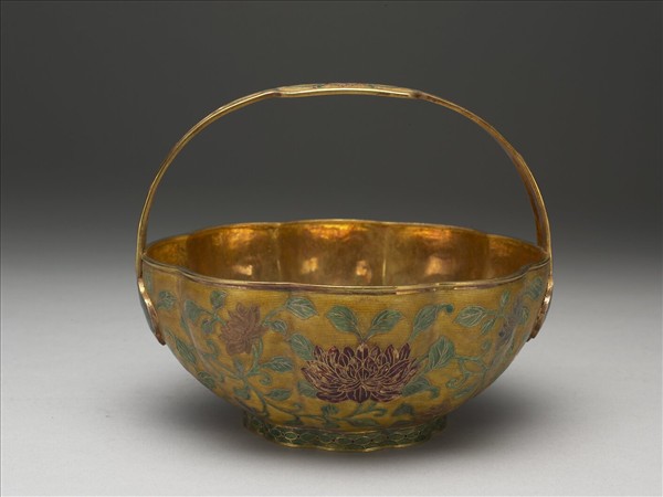 金胎,口足均作八瓣花形,侈口下斂,器身亦凹凸隨作八楞花形。器壁均刻橫向細紋,並飾轉枝番蓮花葉紋,紅色花朵與亮綠葉片相互襯映呼應。提梁與器壁接合處均有一如意雲頭。圈足內有白地雙方框「乾隆年製」楷款。與故琺546一式兩件,同儲一盒。