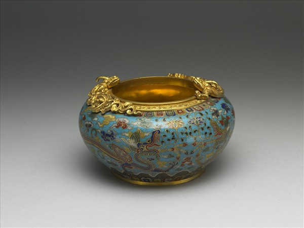 銅胎,圓口豐肩下斂,平底。器口鏨二雲龍盤據相望。口緣下方與器腹最下方均飾蓮瓣紋一圈。器腹壁則掐絲淺藍地雲龍飛騰,其間又雜波濤、番蓮為飾。底外有「乾隆年製」楷款。附木座。