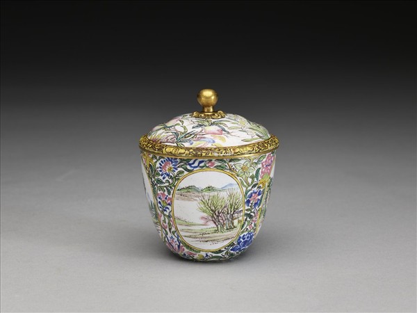 銅胎,球鈕蓮瓣座之斗笠式蓋,侈口斂腹盃。內施淺紫釉,蓋面白地繪桃樹及果實、水仙、芙蓉等,邊緣黃地轉枝紋中飾各種壽字;盃腹四開光,內繪不同的傳統山水,開光與開光之間滿飾各種花葉。底平白地書黑色「康熙御製」無框雙行楷書款。
