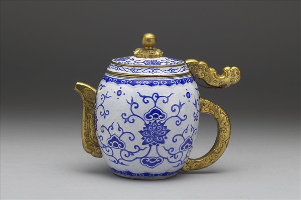 銅胎畫琺瑯。平口,碩腹,流與把露胎,球鈕平頂蓋,蓋的把側揚起一板形螭,以此與器身相連,並有下壓開蓋的功能。全器施白釉為地,繪鈷藍色連枝番蓮紋與雲紋,為仿青花瓷效果。器底藍書「乾隆年製」楷款。