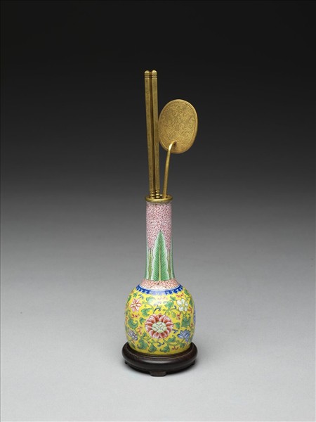 器型為紙槌瓶式。頸飾桃紅錦配翠綠之蕉葉紋。肩圍一圈寶藍色小如意雲頭紋。腹部為黃地轉枝花卉。器底為白地藍料楷款「乾隆年製」。爐瓶盒三件貯於清宮所作楠木盒中,記有「時做乾隆黃地畫琺瑯爐瓶盒一份」,都配有木座,而盒內設計巧妙,將爐瓶盒與鏟箸完整與妥適的放在有格與暗屜的盒中。是乾清宮收藏爐瓶盒的代表。
