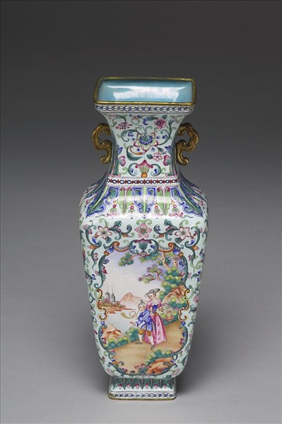 銅胎。長方形瓶,敞口,收頸,頸上有雲形雙耳,碩腹向下微斂,圈足。全器以白色為地,器腹闊面各有開光,內繪提籃西洋仕女與吹號角隨從,遠方有遠山湖水與城堡,雙面圖案對稱,開光外滿飾花卉,窄邊腹加繪八吉祥,頸肩與圈足有變形蕉葉紋,全器鮮艷多彩,色彩明度高。器內施湖藍色釉,底有雙方框紅書楷款「乾隆年製」。有木座。