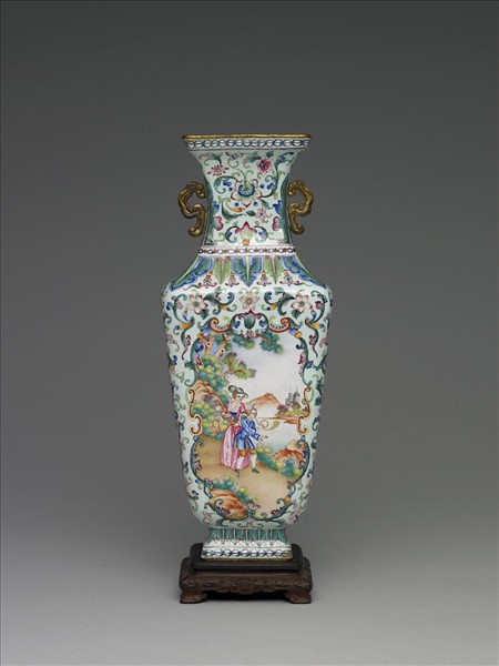 銅胎,立口,縮腰式頸,削肩,方腹下斂,長方足,頸附雲紋式雙耳。器內施湖藍釉,器表白地以各種朵花為錦,頸部四邊、肩及圈足上方飾蕉葉,方腹前後開光內繪不同之西洋人物風景,兩側各繪輪、螺、傘、蓋,和魚、瓶、花、盤長等佛教八寶。底白地書紅色「乾隆年製」雙方框雙行楷書款。附木座。