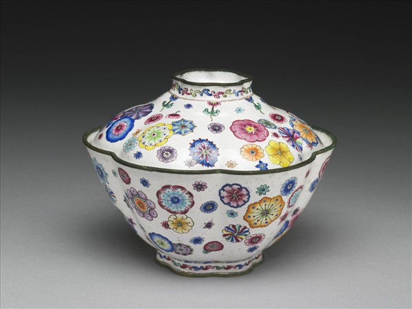 銅胎。六瓣式花口碗,敞口,弧形壁,圈足,帶同形蓋。全器施白釉為地,器與蓋外壁繪飾圖案式朵花,用彩多樣,展現活潑熱鬧的裝飾風格,圈足與蓋抓手側繪多彩卷草紋一周。底與蓋心皆有紅色「乾隆年製」雙方框楷款。