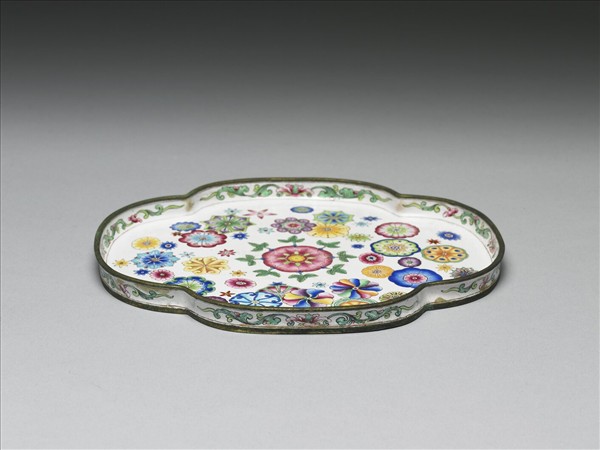 銅胎。海棠式四瓣淺盤,淺直壁,平底。全器內外通體施白釉,器面繪同式回繞中心之正面花卉,用彩多樣,展現活潑熱鬧的裝飾風格,內、外壁繪飾卷葉花葉紋。底有紅色「乾隆年製」雙方框楷款。