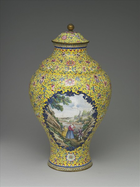 銅胎。帶蓋,蓋上有桃形鈕,口微撇,縮腰式頸,豐肩,下腹束腰,圈足。全器以黃地纏枝花卉為地紋,腹面有靛藍色牡丹圍就開光二個,內繪相對稱之西洋風景人物,並有城堡、湖水為背景,全器用色豐富,釉彩明度高。底為白地,書有藍色「乾隆年製」雙方框楷書款。