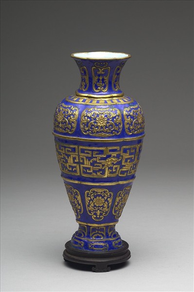 銅胎。六楞花式瓶,撇口,豐肩,碩腹下斂,撇圈足。器內施淺藍釉,器表填寶藍釉,露出鏨飾的鍍金幾何變形龍紋、圖案式團花及幾何雲紋等,底白地書紅色「乾隆年製」雙方框楷書款。附木座。