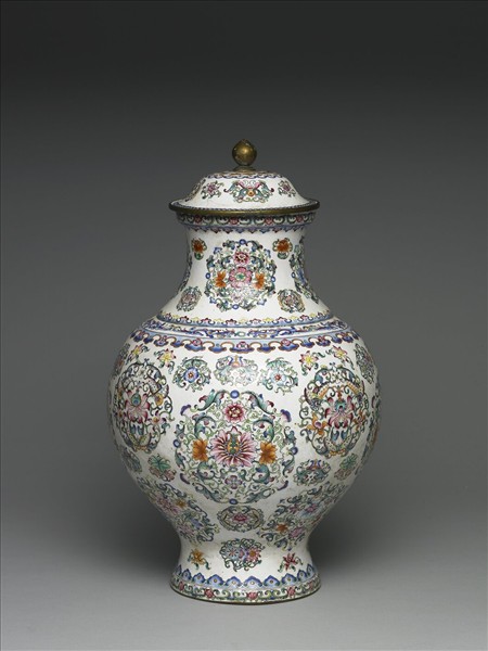 銅胎,桃鈕冠形蓋,侈口,削肩,橄欖形罐腹。內施湖藍釉,器外白地繪各種圖案式團花為主紋,餘以各種雲頭紋、夔龍紋裝飾口、肩及圈足。底白地藍書「大清乾隆年製」雙長方框三行楷書款。這種裝飾繁密西洋式花卉紋飾的文物,應是廣州製品。