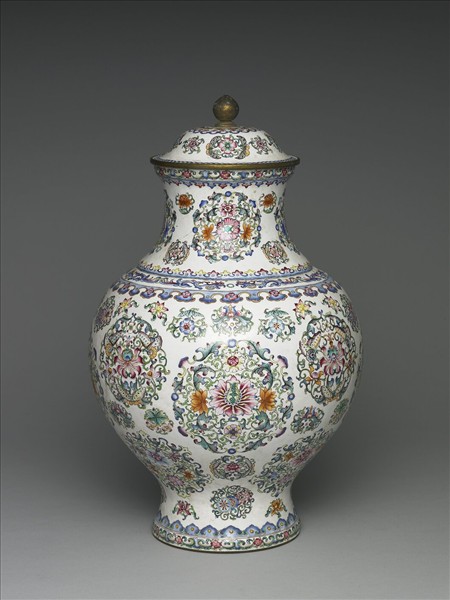 銅胎,侈口,削肩,古銅壺式罐,帶球鈕穹頂式蓋。內施淺藍釉,器外白地繪各種圖案式團花為主紋,口、肩、足邊飾各式如意雲頭紋、纏枝花卉紋及變形龍紋。底白地藍書「大清乾隆年製」雙方框楷書款。