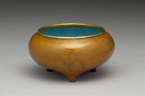 銅胎。缽式爐,斂口,豐肩,碩腹,三足。器身施半透明紫金色釉,釉料帶玻璃光澤,並有深淺釉斑,營造如古銅器銹斑的質感,器內施藍釉。本器造型簡潔,古雅端凝。