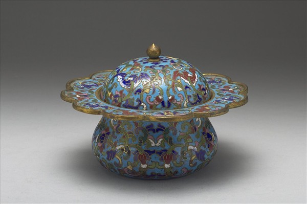 銅胎,侈口,十二瓣花瓣式翻唇,碩腹,平底,帶桃鈕圓頂蓋。以掐絲琺瑯為飾,器身與蓋施淺藍色釉為地,滿飾纏枝番蓮花,蓋身與蓋沿加飾紅與綠色蝙蝠。