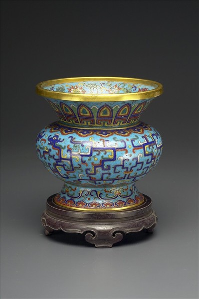 銅胎渣斗式罐,撇口,斜肩,鼓腹,圈足外撇。口內側藍地掐絲番蓮紋。頸掐絲藍地蕉葉紋,腹則為掐絲藍地上下一圈如意雲頭紋,並夾拐子龍為飾。器底有「乾隆年製」楷款。附木座。