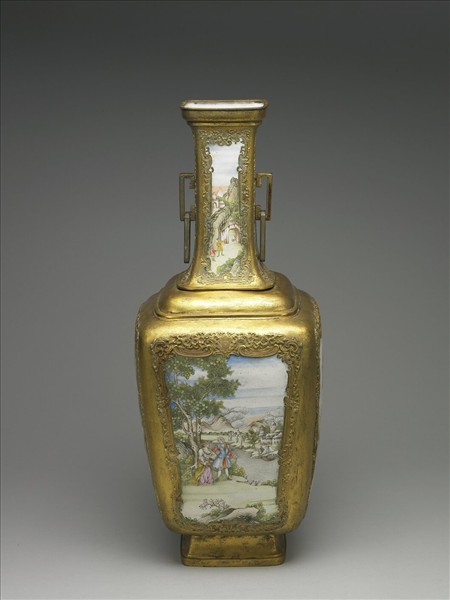 銅胎畫琺瑯,方形瓶,器頸與器身為活動接合。侈口,長頸,雙環耳,階式肩,圈足。器內施白釉,頸部及腹部四面開光,內繪不同的西洋人物、庭園風景畫,開光四周鏨鐫浮雕西洋花草紋,銅胎部分皆鍍金。底為白地黑書「大清乾隆年製」雙行宋體款。與故琺614成對。