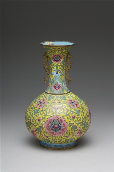 銅胎畫琺瑯,侈口,長頸,雙螭形耳,斜肩,垂腹,矮圈足。器內施淺藍釉,外表黃地,頸部上半繪折枝番蓮紋,下半部四面有葫蘆形開光,內繪藍地番蓮紋。腹部繪黃地纏枝番蓮紋,圈足飾有卷草紋。底為白地紅料書「雍正年製」雙行楷書款並圍飾雙方框。附有一銅膽,與故琺616成對。