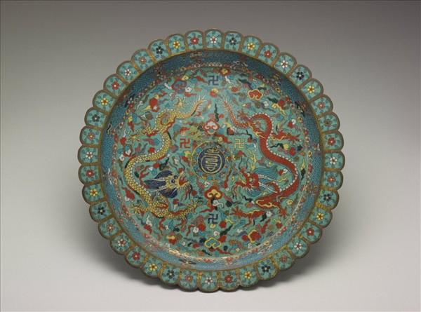 菊瓣折沿平底圈足盤,銅胎鎏金,紋飾掐絲。淺綠色盤心滿飾五色祥雲,中央有紅、黃雙龍拱衛團壽字。斜壁與盤底以淺藍色掐絲雲紋為地,前者更飾八雜寶與八吉祥,底心則有綠地填紅「大明萬曆年造」(1573-1620)雙行楷書款。琺瑯釉層薄,色彩繽紛,是晚明掐絲琺瑯之重要標準器。