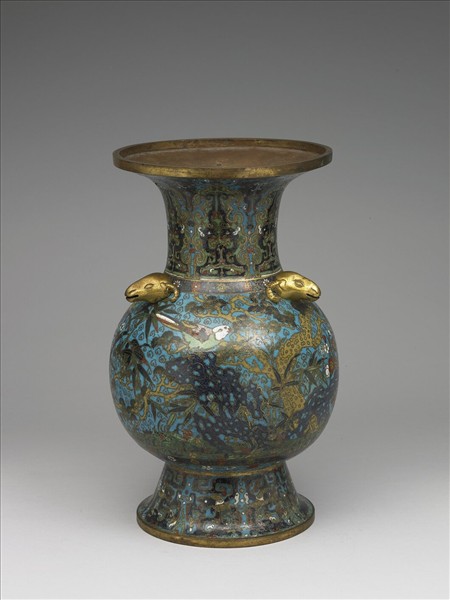 銅胎,侈口,削肩,球腹,高而外撇的圈足,肩周圍鑲三鍍金羊首。器內露胎,器表淺藍地,頸飾對龍對鳳,肩佈雲紋錦飾轉枝花及梅花,腹部雲紋錦間飾松竹梅歲寒三友、湖石及山雀兩對,圈足裝飾拐子龍。底鑄去地陽文「大明景泰年製」長方框楷書偽款。根據豆青綠釉及紋飾風格,應屬十七世紀初期的文物。