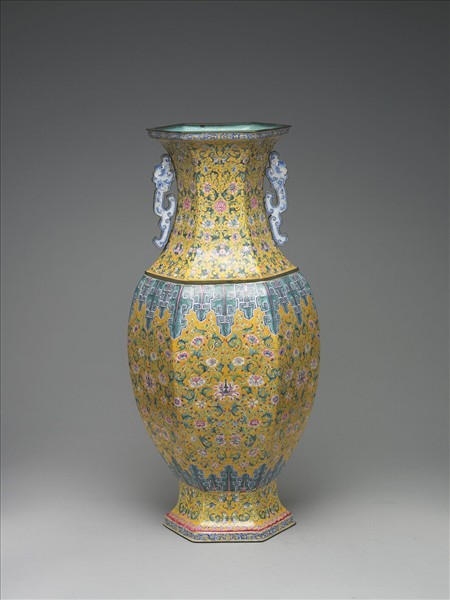銅胎,撇口,夔龍形耳,一耳脫落。器身與圈足皆作六角形,高圈足外撇。全器以畫琺瑯技法裝飾,器內施淺藍釉,器腹上下各有一圈受古銅器啟發之變形蟬紋。全器以黃釉為地,滿飾纏枝番蓮紋。口緣與足上各飾有拐子龍一圈。足內白地青書「大清乾隆年製」三行楷款。與故琺651成對。