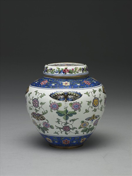 銅胎。口微斂,圓肩,斂腹,圈足,帶蓋。器內施藍釉,器表白地,腹部繪有蝴蝶、花卉,上下各繪有一圈藍地花卉紋;蓋面中央為一朵菊花,外圈為花卉與蝴蝶相間,蓋沿繪有一圈纏枝花卉紋,蓋面及蓋邊花卉之花心部分皆鑲嵌金座托寶石。底白地墨書「乾隆年製」雙圓藍框楷款。