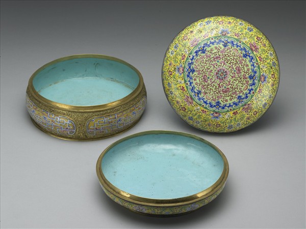 銅胎。有蓋雙層圓盒。器內施天藍色釉。器外壁以畫琺瑯技法裝飾。蓋面中央圓形淺綠地開光,開光中心桃紅色花一朵,由此花向外蔓生卷枝花葉,滿覆開光,開光外黃地滿飾番蓮花葉。上層盒外壁四長形開光,開光內以紅、藍 、白釉繪拐子龍紋,開光外露胎鏨飾卷草。下層盒外壁飾黃地番蓮紋。底淺藍地藍書「乾隆年製」雙方框宋體字款。