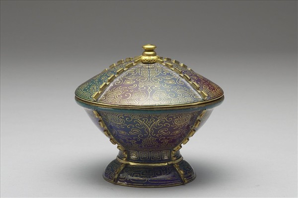 銅胎。敞口,深壁,外撇圈足,帶球鈕圓錐形蓋。器身及蓋上有四道出戟裝飾,器內淺藍色釉,器表以藍、綠、紫紅琺瑯彩塗繪,加飾金彩繪製圖紋,蓋上及器身繪回紋錦地獸面紋,呈鏡面對稱,器身下飾一圈回紋,圈足飾一圈拐子龍紋。底淺藍地黑書「乾隆年製」雙方框楷款。