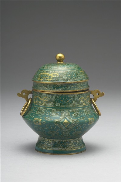 銅胎。罐腹上削下斂中間尖凸成陀螺式,獸首環耳,高圈足,帶桃形鈕二階圓罐式蓋。器內施淺藍釉,器表飾墨綠地釉,描金雷紋為地,繪獸面及犢牛等紋飾,蓋頂飾有如意雲紋。底墨綠地描金「乾隆年製」雙方框雙行楷書款。
