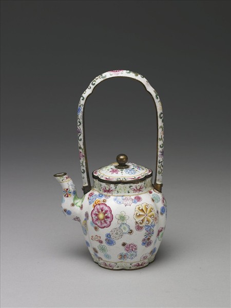 銅胎畫琺瑯,器呈六瓣瓜棱形,直口,短頸,曲流,矮圈足。帶寶珠形鈕六瓣花形蓋,ㄇ形提梁。器內施淺藍釉,器表白地,提梁繪轉枝花卉紋,蓋頂繪四季花卉紋,蓋緣飾一圈番蓮紋。頸部、流口及圈足繪番蓮紋邊飾,全器繪飾各色團錦花紋。白色琺瑯釉上書藍色「乾隆年製」四字楷款,外加雙圈。