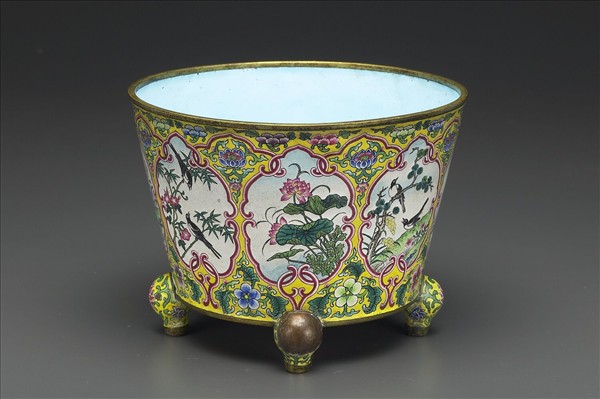 銅胎,上侈下斂筒形器身,四象足。器內施淺藍釉,器表黃地八開光,依次繪蟠桃、葫蘆、雙蝠;朱梅、白梅;竹、山茶、雙蝶;禾穗、雙鵪;松和山鵲;蓮花;竹、牽牛花和山鵲;雙鵪、雙蝠和萱草。開光外填飾各種番蓮、牡丹及五瓣花葉,四足飾番蓮花。底黃地以雙鳳首尾相銜圍成圓框,中央藍圓框內白地書紅色「雍正年製」雙行宋體字款。