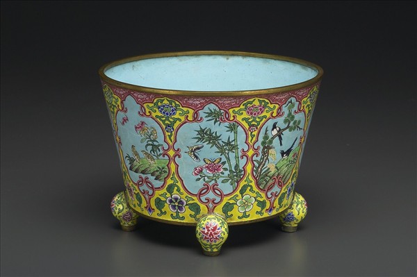銅胎畫琺瑯,侈口,深腹,筒形器身,四足。器內施淺藍釉,器表黃地八開光,依次繪藍地雙鵪、雙蝠和萱草;竹、山茶、雙蝶;松和山鵲;蓮花;禾穗、雙鵪;蟠桃、葫蘆、雙蝠;竹、牽牛花和山鵲;朱梅、白梅。開光外填飾各種番蓮、牡丹及五瓣花葉,四足飾番蓮花。底黃地以雙鳳首尾相銜圍成圓框,中央藍雙圓框內白地書紅色「雍正年製」雙行宋體字款。