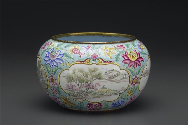 銅胎畫琺瑯,斂口,斜肩,圓腹,矮圈足。器內施淺藍釉,器表粉青地上四開光,內繪四景山水,開光外繪各式花卉,有蓮(荷)、水仙、菊、梅、茶花等。底白地藍書「乾隆年製」四字楷款,外圍雙方框。