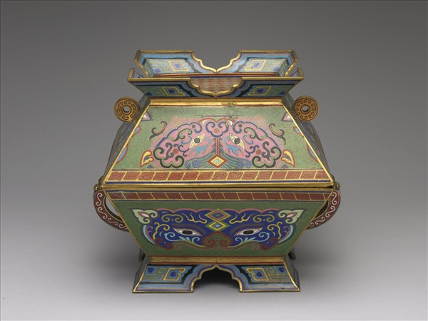 銅胎,掐絲琺瑯。仿青銅禮器簠之造型,長方梯形,帶蓋,侈口,斜壁,矩形足外撇,器與蓋造型相等,惟器身為雙螭板耳,蓋為雙環。器腹與蓋均以綠地掐絲回紋為地,中央飾獸面紋,獸面各以粉紅、藍色為主調,其標示眉毛、鼻子、面貌的曲線,則以黃、綠、紅等色填飾。器之矩形足外作藍地幾何紋裝飾。器裡與底施藍釉,內附帶把銀屜。