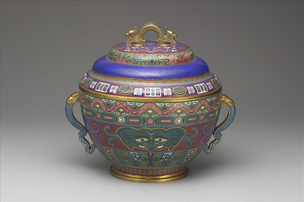 銅胎,掐絲琺瑯。仿青銅器敦之造型,侈口,碩腹,下微斂,器腹兩側嵌雙螭首板耳,圈足,帶三階圓頂蓋,附雙鳳蓋鈕。器與蓋以綠色、藍色或紅色釉為地,裝飾獸面紋、幾何式獸面紋、蓮瓣紋及多種幾何裝飾圖案,紋飾繁複熱鬧,釉色濃艷明度高。器內與底施藍色釉,內附銀製小屜。