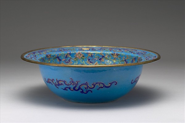 銅胎,掐絲琺瑯。侈口,寬折沿,深弧壁,平底。全器施藍色釉,盆心飾一正面蓮花,內壁飾番蓮、雲紋數道,折沿作雲紋與卷葉紋,器外有三組螭紋,釉色明亮。器底有掐絲篆款「大清乾隆年製」。