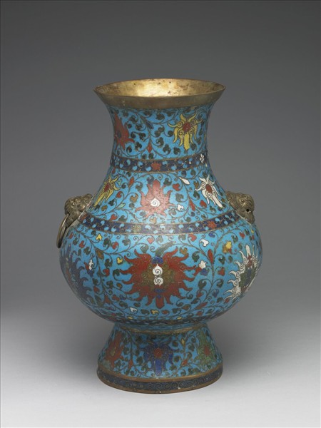 銅胎,掐絲琺瑯。器仿青銅器尊造型,撇口,削肩,夸腹,撇圈足,平底,肩上嵌鋪首銜環一對,一環已脫失,器裡與底露胎。器身施淺藍色釉為地,以深藍飾朵花寬帶三將裝飾分為四層,每層皆飾轉枝番蓮紋。釉色濃重有小氣泡。