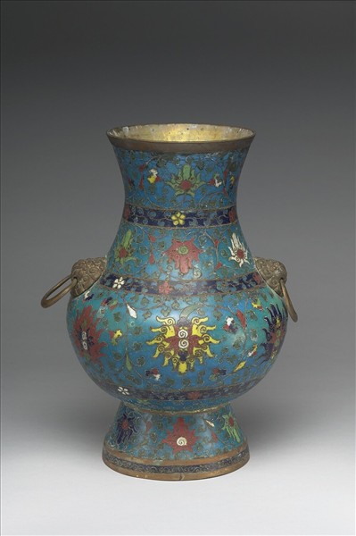 銅胎,掐絲琺瑯。器仿青銅器尊造型,撇口,削肩,夸腹,撇圈足,平底,肩上嵌鋪首銜環一對,器裡與底露胎。器身施淺藍色釉為地,以深藍飾朵花寬帶三將裝飾分為四層,每層皆飾轉枝番蓮紋。釉色濃重有小氣泡。