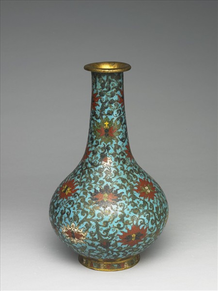 小口翻唇,長頸,削肩,碩腹,圈足,唇與底露銅胎處鎏金。器身施淺藍釉為地,滿飾各色纏枝番蓮紋,足上有蓮瓣紋與朵花各一圈。器底剔地陽刻「景泰年製」四字楷款。