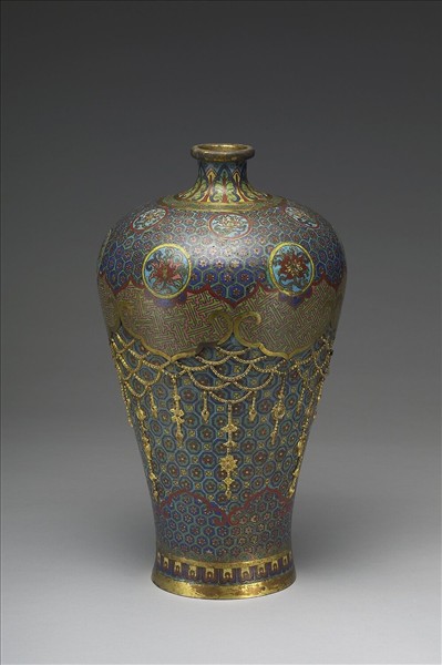 銅胎,小口,短頸,豐肩,斂腹,圈足外撇。器內露胎,頸飾蕉葉,肩裝飾一圈如意雲頭紋,及含朵花之龜甲錦間開光,內飾番蓮花;肩下垂含卍字不斷紋錦之雲肩六,瓔珞垂掛在飾龜甲紋和卍字紋錦地的瓶腹,腹下方飾如意雲頭紋、含朵花之龜甲錦和蓮瓣一圈,鍍金圈足。