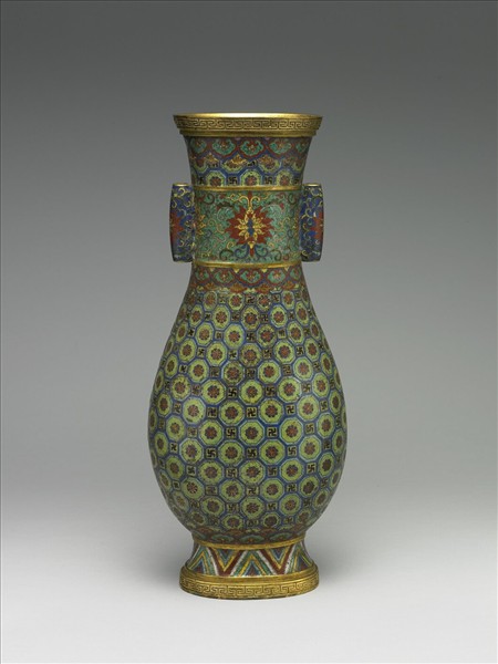 銅胎,侈口,削肩,貫耳,外撇圈足,橄攬形扁腹瓶。橢圓形口沿鐫回紋一圈,頸部上下佈如意雲頭紋,中間飾纏枝番蓮;肩、腹飾含寶相花的龜甲紋及含卐字的四方格紋,二階式圈足飾三角回紋及鐫回紋一圈。底鑄去地陽文「大清乾隆年製」長方框三行楷書款。