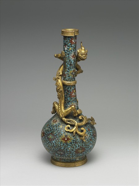 銅胎掐絲琺瑯,圓口,長頸,斜肩,垂腹,短圈足,有一夔龍雕像纏繞於瓶頸處。全器為藍地纏枝番蓮花紋,器腹下緣飾有一圈菊瓣紋,圈足上飾有花卉紋。底部露胎,陰刻羯磨杵紋。