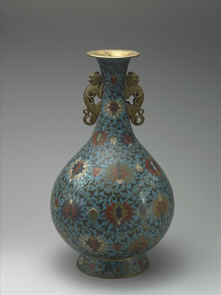 銅胎掐絲琺瑯,侈口,長頸,雙獸耳,斜肩,圓腹,外撇圈足。全器飾各色纏枝番蓮花紋,圈足上飾八瓣花紋。