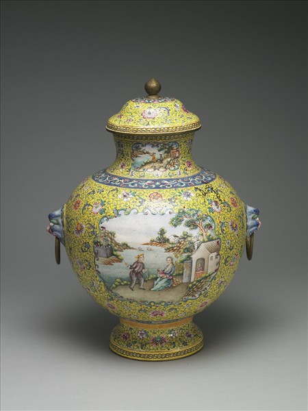 銅胎畫琺瑯,子母口,短頸,圓肩,圓腹,雙獸首銜環耳,外撇圈足,帶蓮苞鈕階式蓋。器內施淺藍釉,器外黃地四季花卉錦地,蓋頂繪有蓮瓣紋,頸部及腹部正反面各有一開光,內繪西洋人物、山水風景,肩部繪有一圈藍地夔龍紋,腹部下端繪有一圈藍地四季花卉紋及黃地回紋,器緣接繪有一圈環帶紋。底為白地藍書「大清乾隆年製」雙方框三行楷書款。