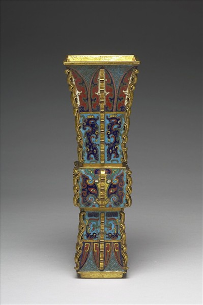 銅胎,掐絲琺瑯。仿青銅器觚之造型,但外撇弧度小而顯瘦長,全器皆作方形,喇叭口,長頸,鼓腹,高足外撇,四棱脊與每面中央皆出雲式戟,露銅胎處皆鎏金。器身施淺藍釉為地,腹每面飾獸面紋,以此為中心口與足對稱飾回紋、蕉葉紋與對螭。器底刻「乾隆年製」楷款,加雙方框。