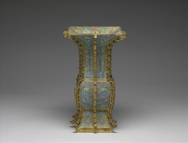 銅胎,掐絲琺瑯。仿青銅器觚之造型,全器皆作方形,喇叭口,長頸,鼓腹,高足外撇,四棱脊與每面中央皆出戟。器身施淺藍釉為地,腹每面作金屬絲回紋錦地上飾獸面紋,以此為中心口與足對稱飾回紋、蕉葉紋與花卉,口內飾番蓮紋。釉色凝重灰濁有小氣泡。