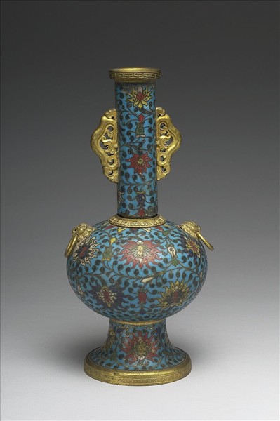 銅胎,掐絲琺瑯。盤口,直長頸,扁球腹,高撇足,頸上嵌鏤雕盤螭雙板耳,腹上有鋪首銜環一對。器身施淺藍色釉為地,滿飾各色纏枝番蓮紋,口、頸與足各有鏨金工字紋、蓮瓣紋、卷葉紋裝飾一周。