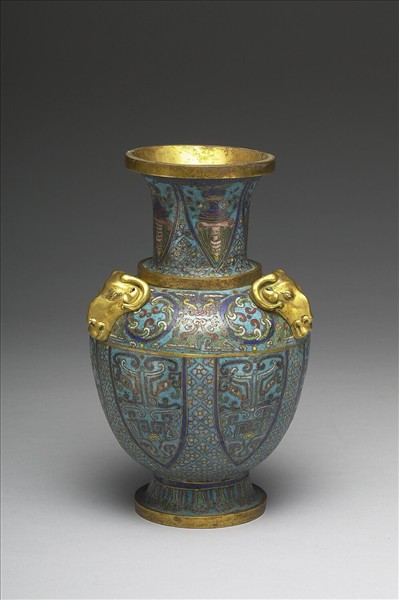銅胎,掐絲琺瑯。撇口,收頸,豐肩,肩上嵌三牛首,碩腹下斂,撇足,露銅胎處皆鎏金。器身施淺藍釉為地,頸與腹俱作四瓣朵花地上飾蟬形紋飾,頸部為蟬紋,腹部作獸面紋,肩冏紋與獸面紋相間,足蓮瓣紋一圈。器底有剔地陽文「景泰年製」楷款,加方框。