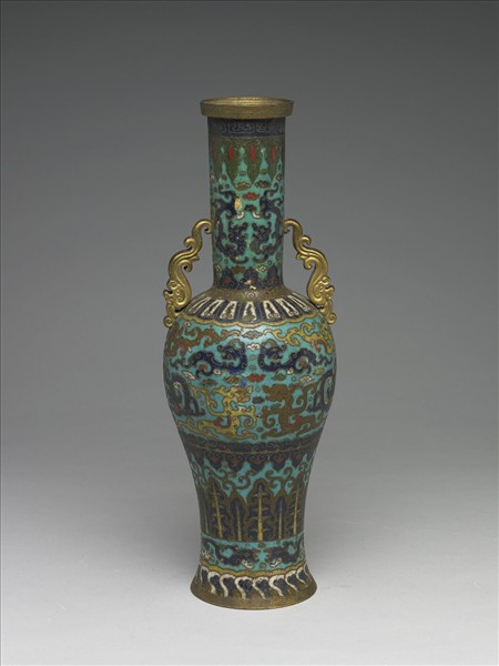 銅胎,掐絲琺瑯。盤口,直長頸,碩腹下歛,肩頸處嵌板形螭耳一對,撇足。器身施湖藍釉為地,腹部飾造形螭紋多樣,其餘由口至足分飾葉紋、對螭、蓮瓣紋、雲紋等,釉色濃厚有小氣泡。