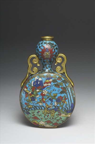 銅胎, 葫蘆式瓶, 唇口, 頸部鼓漲渾圓,而瓶身扁圓,接長方形鎏金矮足,鑲鎏金雲紋雙耳。滿施淺藍色釉,頸及瓶側飾纏枝蓮紋; 腹部一面飾梅、竹及瑞鹿, 另一面則有殿堂屋簷及仙鶴銜桃枝遨翔海上仙山,寓意海屋添籌、鹿鶴(六合)同春。應為晚明作品。