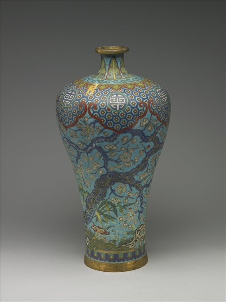 此件掐絲琺瑯銅胎梅瓶頸飾蕉葉紋,肩飾雲肩式開光,內有團壽與六方朵花,腹部飾梅、竹與靈芝。以上裝飾紋樣顯示這是一件充滿吉祥寓意的器物。竹、梅與松是中國傳統描繪冬日乍暖還寒時慣用的視覺題材—即「歲寒三友」,經常搭配有祥瑞之意的靈芝出現。古人好於冬日使用具這類圖樣的物品作為擺設,以企求冬去春來。此器的梅花使用同質粉紅琺瑯色料燒造,故應為清代的作品。