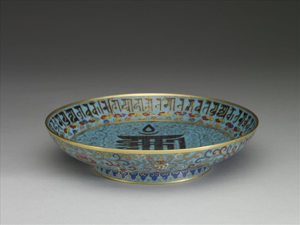 侈口,淺壁,平底,圈足。全器紋飾以掐絲技法完成,通體藍地,金屬絲精細,琺瑯料濃厚鮮麗。盤內壁飾梵文一周,下襯五彩朵雲紋,內底有卷鬚錦,盤心有一由七個梵文及三個符號組成的「十相自在」吉祥紋飾;盤外壁為蓮座佛教八寶襯纏枝番蓮紋錦地,圈足飾朵雲紋。底部有陰刻「乾隆年製」四字雙行楷書雙方框款。故琺763~772同儲於一木胎皮盒內。