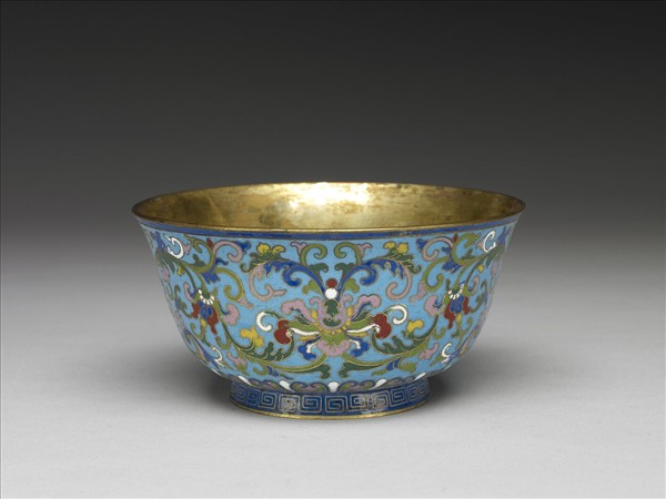 銅胎,敞口微撇,深弧壁略斂,圈足。器身淺藍地,以掐絲技法製作花紋。器外壁滿飾纏枝番蓮花,或盛開、或含苞,花葉色調多樣,有繁盛之趣。近足蓮瓣紋一圈。足牆外壁深藍地回紋,足內露胎,光素無款。